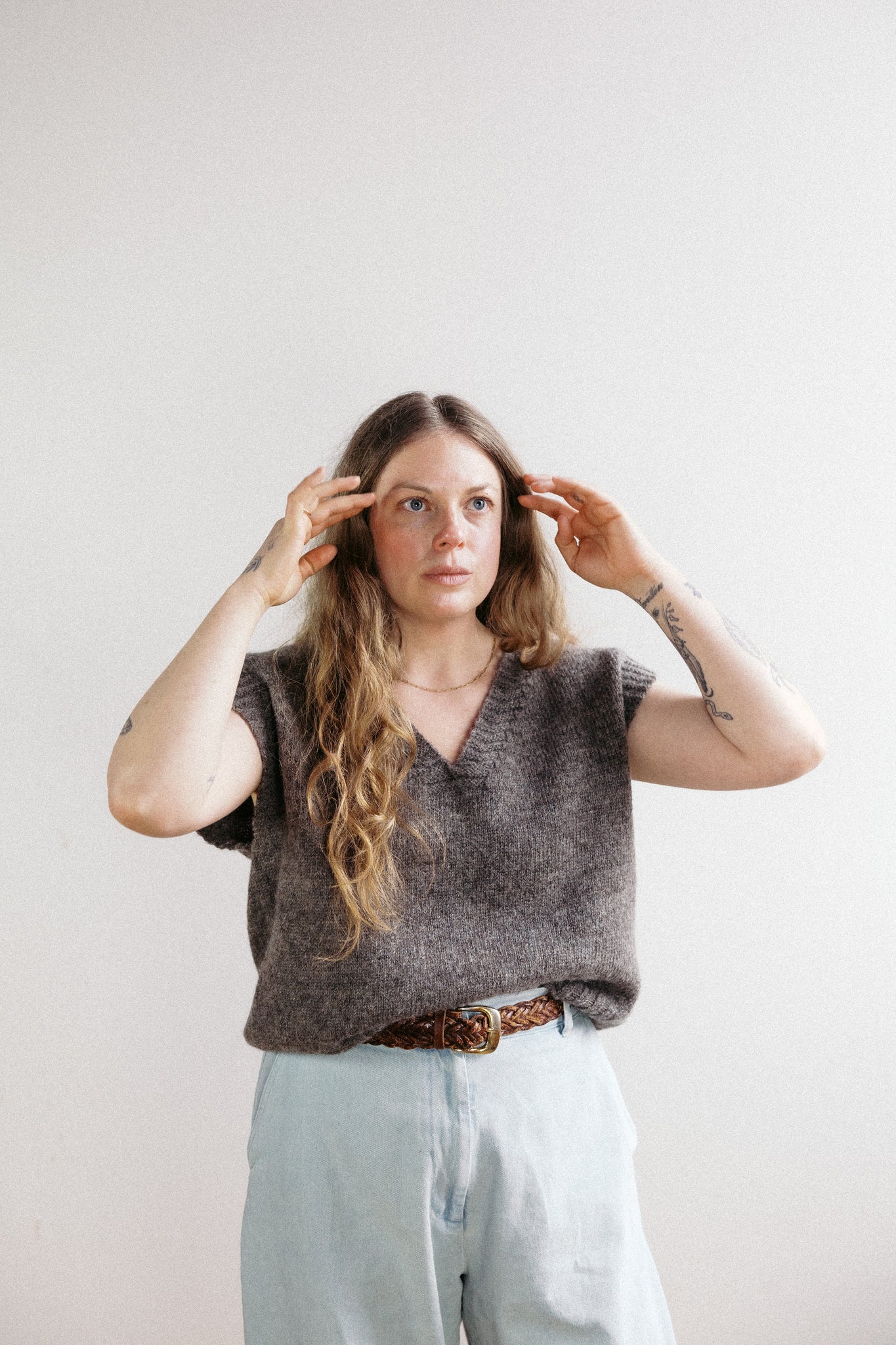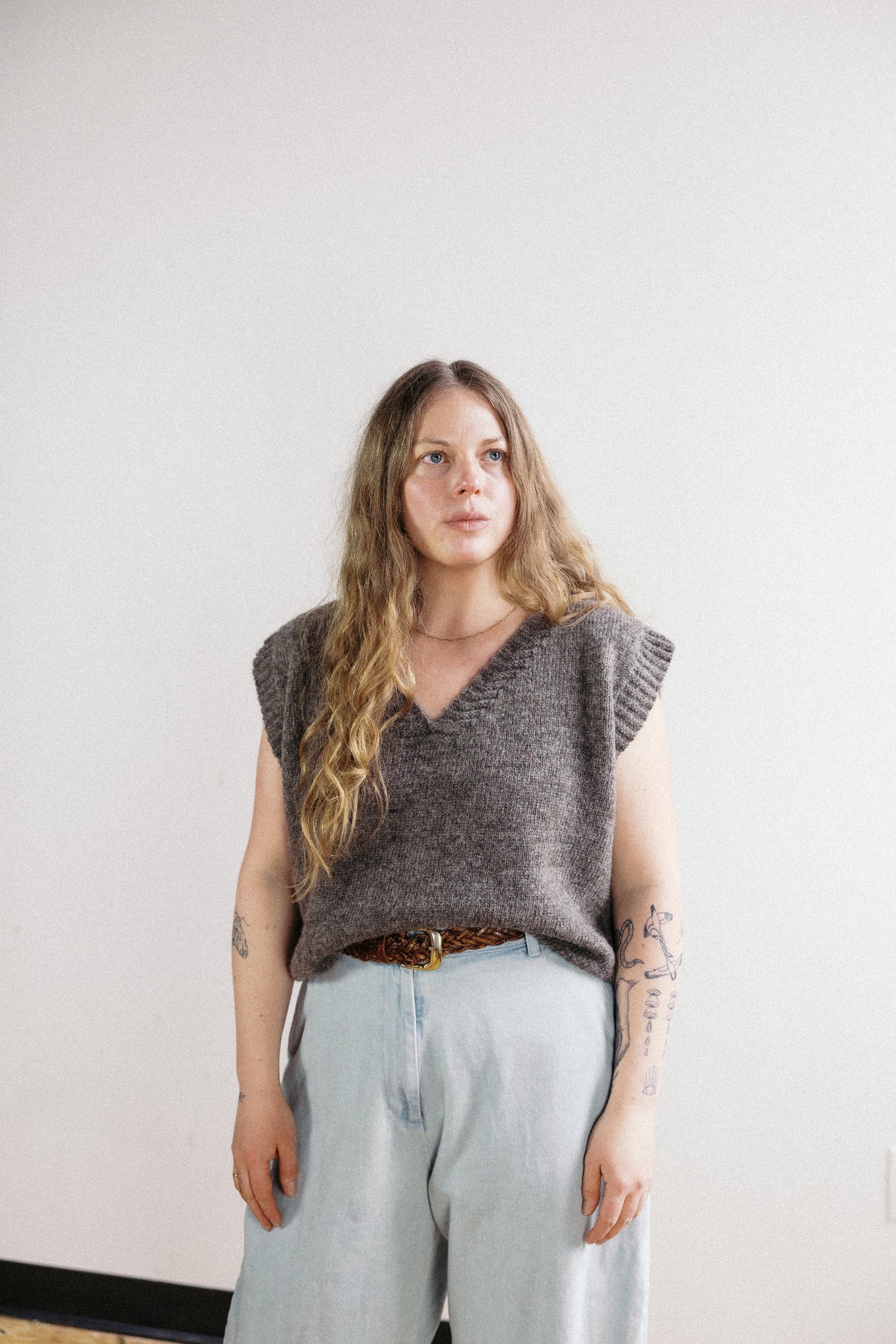 The Ribbed Vest is knit with our DK weight yarn - Cyrus uses a loose loop length to keep it cool & boxy. Grace is 5'4" & wearing a size Medium in Heather Gray & Ana is 5'4" & also wearing a size Medium in the Studio.